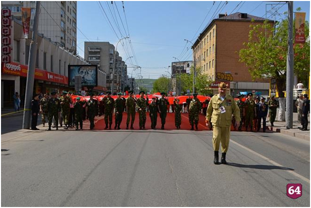 Ключевым событием года должен был стать марш Бессмертного полка. Наша организация уже традиционно открывает шествие в областном центре: не менее 50 человек - поровну взрослых и детей - несут развернутую копию (10 на 20 метров) Знамени Победы. В дальнейшем мимо этого полотна - главного символа праздника - проходят люди. На фоне полотнища вручаются награды.
